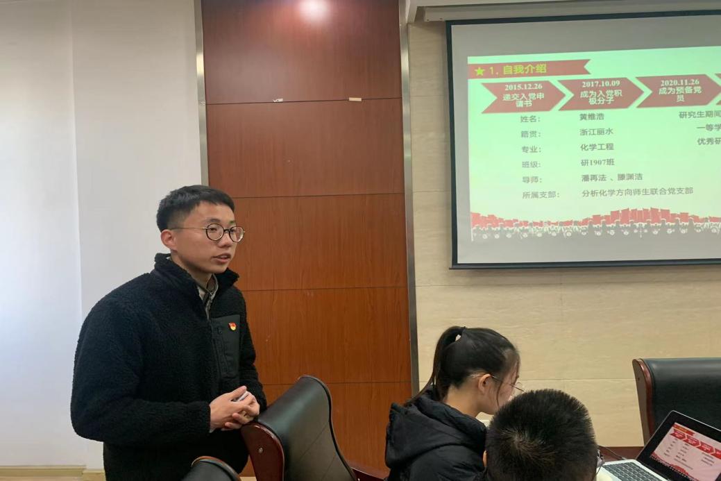 此次转正预备党员有三人,分别是黄维浩、何歆滢和王童,三名同志分别进行了预备党员转正答辩。第一位是王童同志,从本人简况、预备期间表现以及自我鉴定三方面进行了介绍。王童同志于2020年12月10日光荣成为一名预备党员,预备期间,取得了党课结业证书,学习成绩优秀,生活和工作中始终发挥党员的先锋模范作用,服务于大众,并且能充分认识到不足加以改进;其次是何歆滢同志的转正汇报,她从思想、学习、工作、生活四个方面报告了其在预备期间的表现,思想端正,学习优异,工作积极,生活作风优良,并指出自己的不足之处,为之努力;最后是黄维浩同志,他入党动机端正,思想认识到位,科研刻苦,工作认真负责,对于不足的地方能给出改进措施并积极实践之。