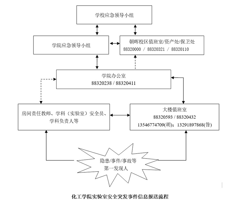 任何人员得知已经发生或可能发生的实验室安全突发事故信息和情况后必须立即向值班室和学院办公室报告。接到报告信息后,必须问清下述信息报送内容,并第一时间按应急预案做出处理和报告。