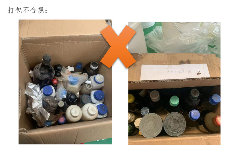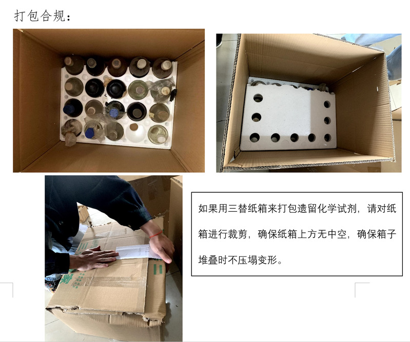 各实验室分类包装要求:(1)废化学试剂的包装应符合相容性原则,不相容的两种或多种化学试剂严禁置于同一包装容器内,需按化学试剂分类原则分装于不同的包装容器内;(2)不明化学试剂务必妥善包装,瓶口应密封完好(磨口的玻璃瓶必须用自封袋扎紧,防止漏液),各瓶装试剂之间必须有填充物,避免晃动碰撞;(3)外包装可用学院回收的旧纸箱或三替纸箱。因探索平台纸箱是由上海发货,目前库存不足,建议用三替纸箱替代;(4)冷藏药品请自制冰袋一并放入打包箱中,确保运输途中安全;(5)含汞的设备请用泡泡纸包装妥当,防止打碎或漏液;(6)如果用三替纸箱来打包遗留化学试剂,请对纸箱进行裁剪,确保纸箱上方无中空,确保箱子堆叠时不压塌变形。