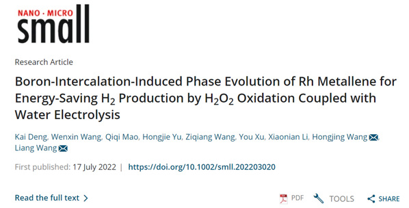 该成果以“Boron-Intercalation-Induced Phase Evolution of Rh Metallene for Energy-Saving H2 Production by H2O2 Oxidation Coupled with Water Electrolysis”为题发表于《Small》,论文第一作者为化学工程学院博士后邓凯,通讯作者为化学工程学院王亮研究员和王鸿静副教授。
