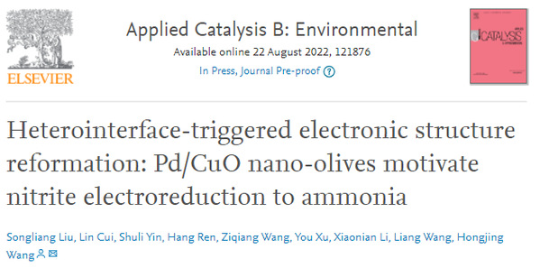 该成果以“Heterointerface-triggered electronic structure reformation: Pd/CuO nano-olives motivate nitrite electroreduction to ammonia”为题发表于《Applied Catalysis B: Environmental》,论文第一作者为化学工程学院博士研究生刘松良,通讯作者为王鸿静副教授。点击左下角“阅读原文”获取论文全文。