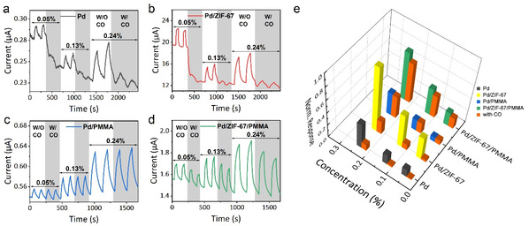 其次通过实验证实Pd纳米团簇与ZIF-67组装阵列间存在显著电子转移,电子从Pd转移向ZIF-67,导致Pd纳米团簇中存在大量电子空穴,进而使得Pd纳米团簇容纳H原子的能力显著增强,Pd/ZIF-67/PMMA对氢气(1%浓度)的响应灵敏度达到22.56%,较之Pd/PMMA提高了2倍。与此同时提出的Pd/ZIF-67/PMMA复合纳米结构中,表面PMMA层的气体分子筛过滤作用仍赋予其抗CO毒性和对H2的选择性响应能力。