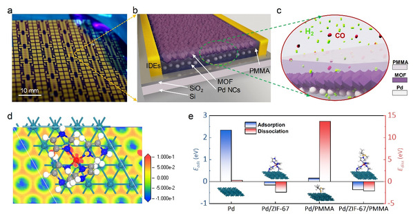 鉴于此,化学工程学院胡军教授课题组提出一种在Pd−聚合物复合材料中插入金属有机框架(Metal–organic framework,MOF)作为界面层来增强气敏性能的新机制与研究思路。首先采用密度泛函理论(Density Functional Theory,DFT)计算揭示MOF和聚甲基丙烯酸甲酯(poly(methylmethacrylate),PMMA)对Pd纳米团簇吸/脱附氢气的影响机制,重点阐明MOF与金属纳米团簇间的界面电子耦合作用对氢气吸附和解离能的演变规律。首次提出并设计了Pd/ZIF-67/PMMA复合纳米结构,并以此为H2感知材料,构建了兼具高灵敏度、快速响应和抗CO毒性的氢气传感器件。