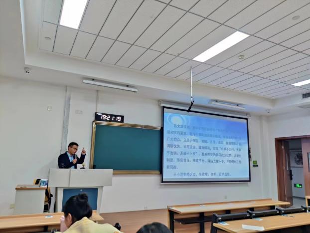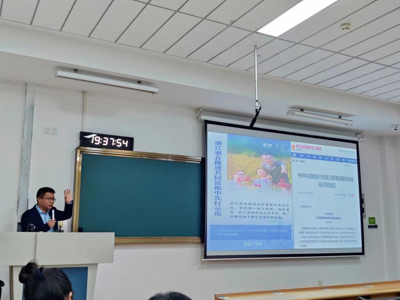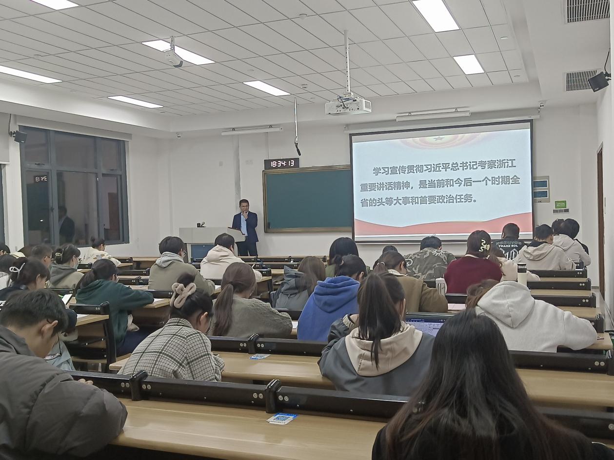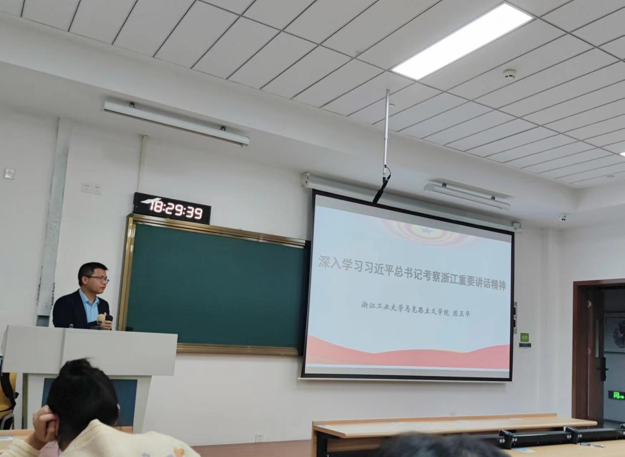 2023年11月21日晚上,化学工艺方向师生联合党支部、精细化工本科生党支部、化学工艺本科生党支部、精细化学品方向师生联合党支部、硕士研究生直属党支部在莫干山校区公共教学楼210举办了“深入学习习近平总书记考察浙江重要讲话精神”为主题的红色半月谈主题党课,本次党课有幸邀请到了马克思主义学院的陈玉华老师作为主讲人,带领我们深入、及时、全面地学习了习近平总书记考察浙江重要讲话精神。