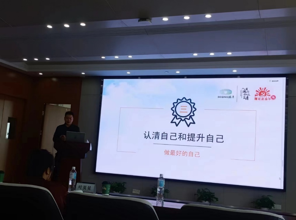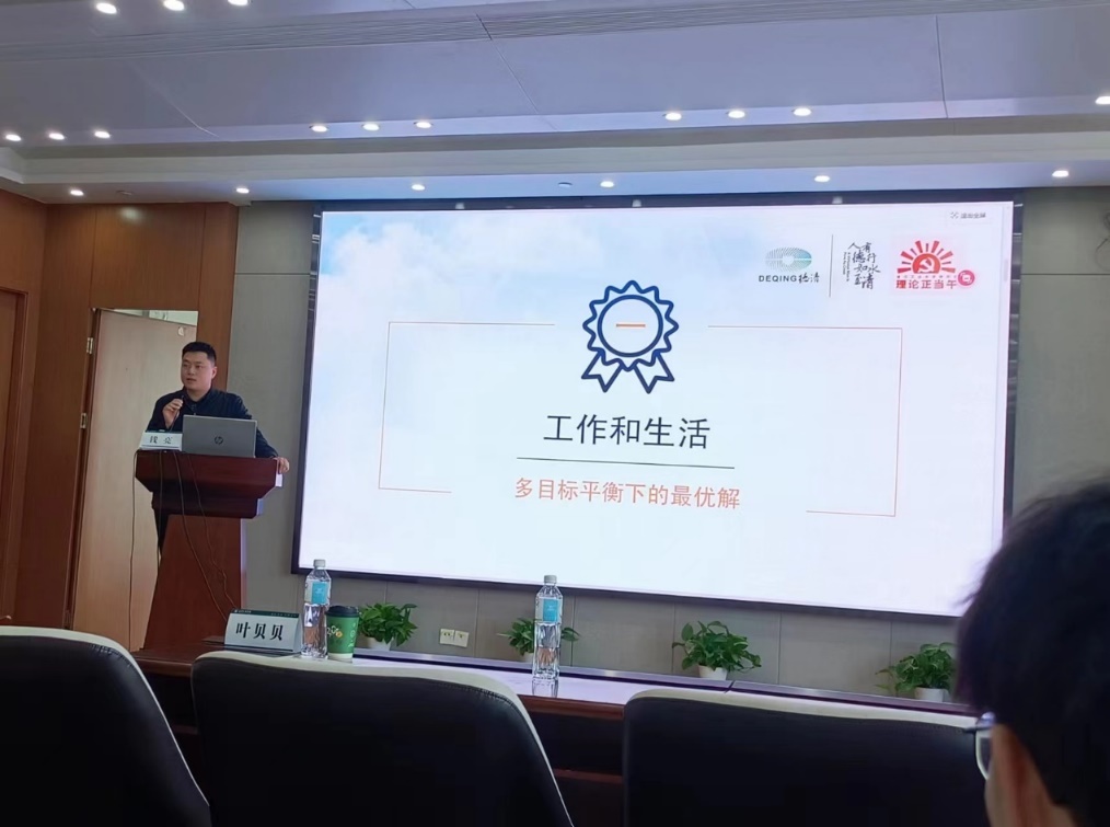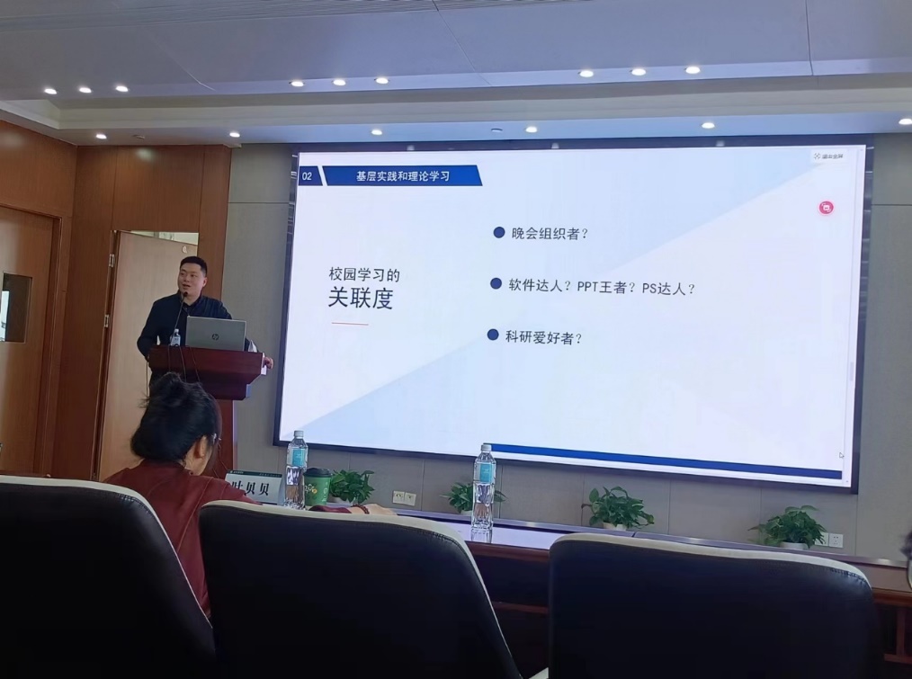 钱亮老师首先从对自己毕业后三年半的工作和生活作了阐述。主要分了四个阶段,第一阶段,刚刚通过选调生考核并分配到德清县新安镇工作,在这里他下基层、干实事,艰苦奋斗为人民群众排忧解难;第二阶段,调岗到了政研室从事文书工作,在这里他与同事经常奋斗至凌晨,相互帮助共同进步,结下了深厚的友谊;第三个阶段,调岗至人才办,服务人才是他的责任,同时老师也向我们介绍了德清的相关人才政策;第四阶段,是两个月前出任高新区人才局副局长,新的挑战和机会迎接着他。