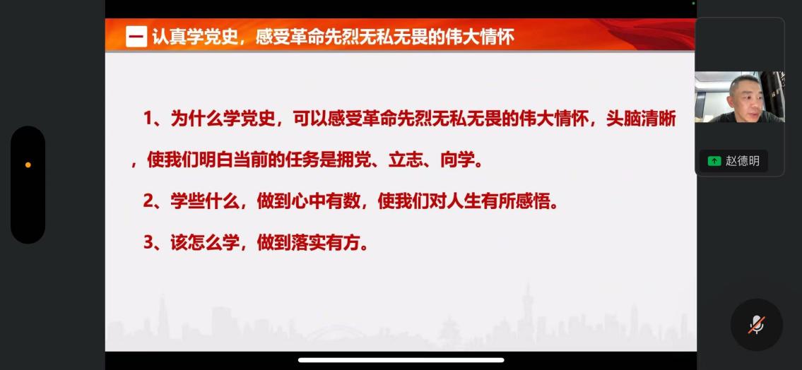 第一部分赵德明老师讲述了为什么学习党史,可以感受革命先烈无私无畏的伟大情怀,头脑清晰,使我们明白当前的任务是拥党、立志、向学。党史中有有很多成功的经验:党的建设经验、领导武装斗争的经验、执政的经验、搞社会主义的经验等,以及经受挫折失败的教训,这些都是我们的财富。作为年轻一代认真学习党史,对继承和发扬光大革命传统、党的优良作风,对提高自己认知能力和处理实际问题的能力都是是十分必要和有益的。