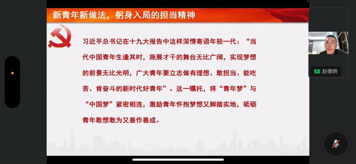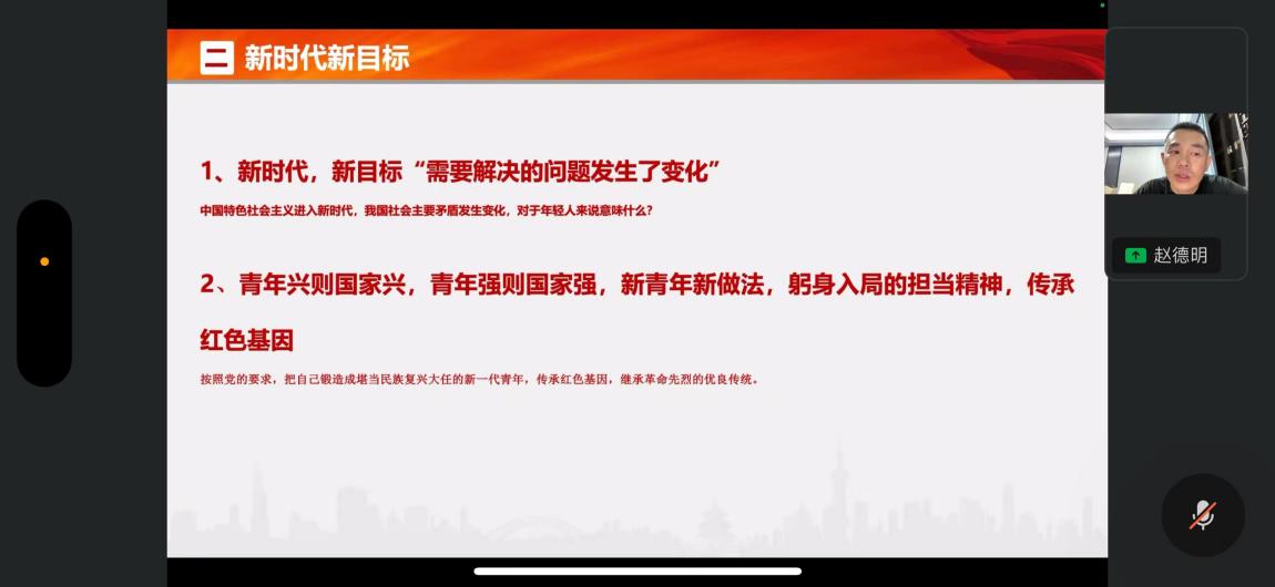 第二部分赵老师讲述了中国特色社会主义进入新时代,我国社会主要矛盾发生变化对年轻人意味着什么?“主要矛盾的转变将会推动一系列政策措施,工作重点的转变,意义重大”,经济发展的不平衡不充分的同时,也为年轻人提供了发挥自己才能的空间和想象。习近平总书记在十九大报告中这样深情寄语年轻一代:“当代中国青年生逢其时,施展才干的舞台无比广阔,实现梦想的前景无比光明,广大青年要立志做有理想、敢担当、能吃苦、肯奋斗的新时代好青年”。并重点讲述了以新思想、新使命、新本领、新四个方面,按照党的要求,锻造新时代的新一代青年。青年兴则国家兴,青年强则国家强,新青年新做法,躬身入局的担当精神,传承红色基因。