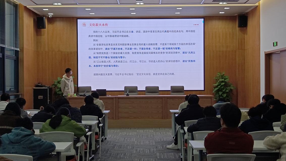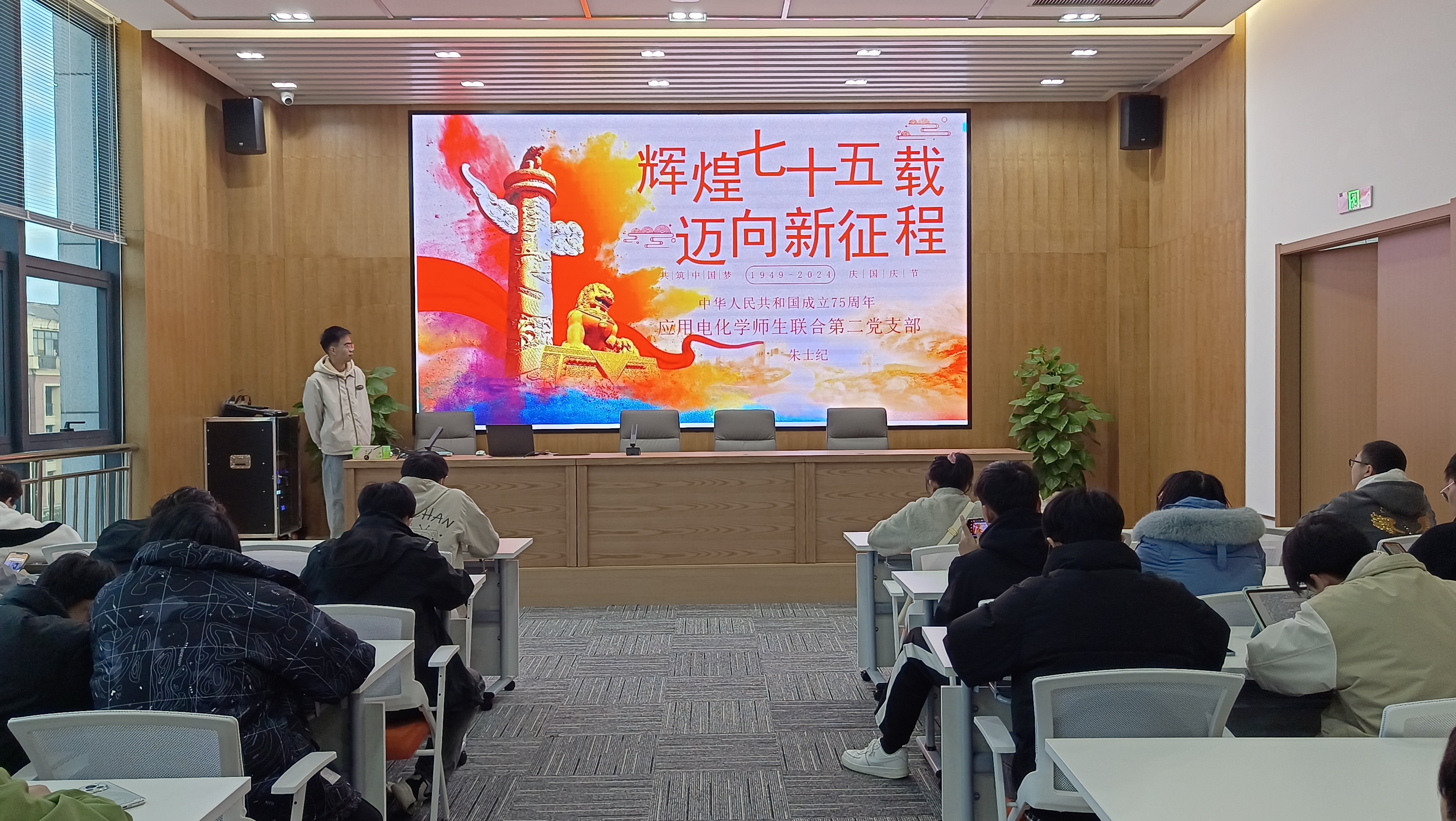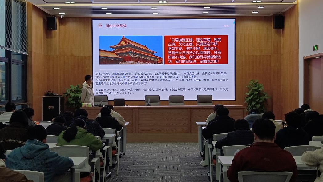 2024年11月26日星期二下午,化学工程学院学生党员、入党积极分子齐聚图书馆党群服务中心,参加由学院党员之家举办的“红色星期二”党员固定学习活动。本次学习的主题为“辉煌七十五载,迈向新征程”,由化工学院应用电化学师生联合第二党支部朱士纪同志担任主讲人。