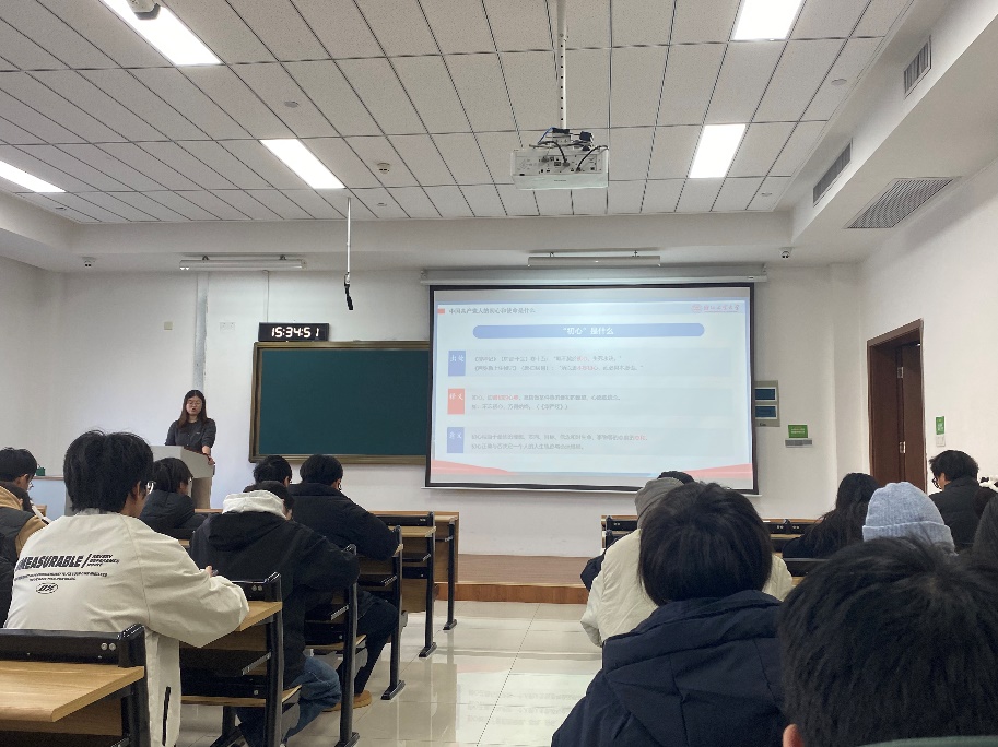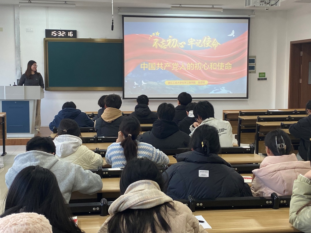 2024年12月16日下午3点30,化学工程本科生第三党支部、硕士研究生直属党支部、化工自动化方向师生联合党支部在莫干山校区公共教学楼210举办了“中国共产党人的初心和使命”为主题的红色半月谈主题党课,本次党课有幸邀请到了陈思奇老师作为主讲人,为我们展示了中国共产党人初心使命的内涵。