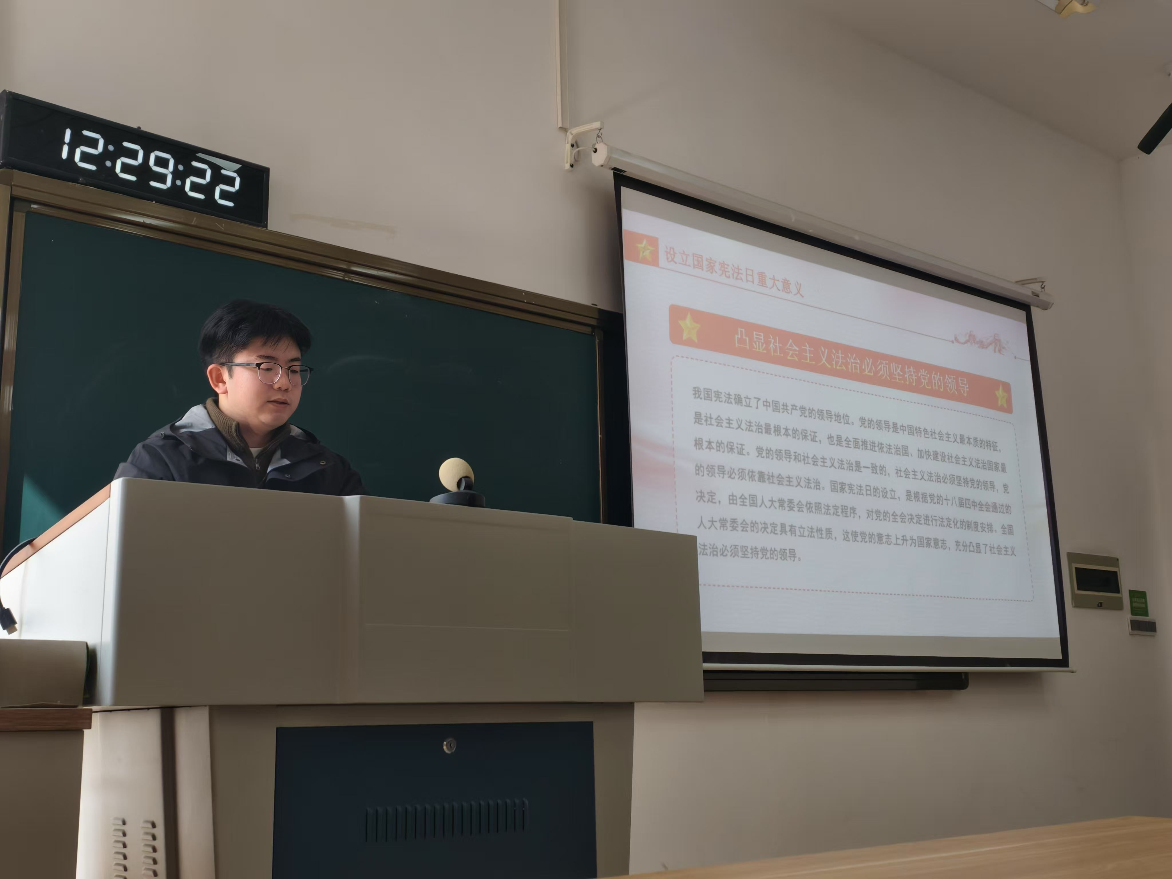 2024年12月4日是我国第十一个国家宪法日,法治兴则国兴,法治强则国强。心存敬畏之心,方能行有所止。本次学习不仅回顾了宪法的历史沿革,更对其精神内核进行了深入的剖析与探讨。宪法是厚重的,承载着一个国家的过去现在和未来,同党和人民开辟的前进道路和积累的宝贵经验紧密相连。本次活动在知识普及、理论阐释、观念引导三方面全面发力,用实际行动为校园宪法宣传教育常态化、长效化建设添砖加瓦。