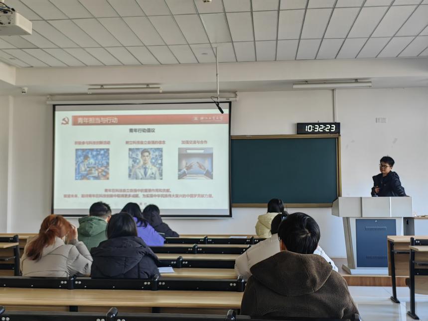 王俭老师特别强调了青年在科技创新中的关键作用。他引用习近平总书记的讲话,鼓励青年党员勇当科技自立自强的生力军和突击队。在讲座中,王老师分享了“羲和号”青年科研团队、浙江工业大学青年教师刘艺等的科研事迹,充分展现了新时代青年科技人才的责任与担当。