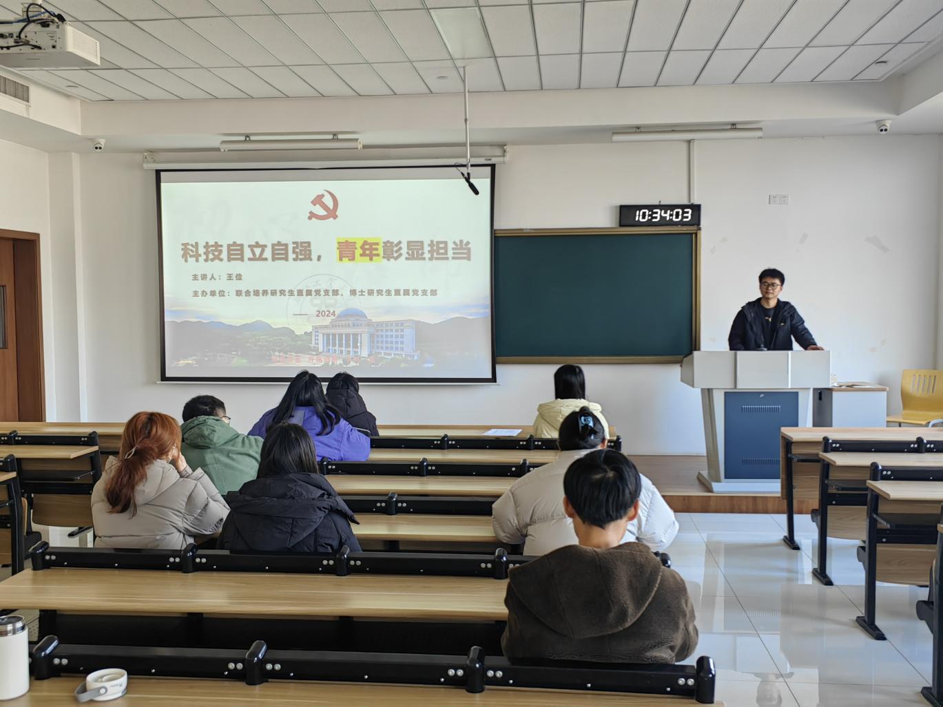 2024年12月27日上午10点,联合培养研究生直属党支部,博士研究生直属党支部在莫干山校区公共教学楼306举办了“科技自立自强,青年彰显担当”为主题的红色半月谈主题党课,本次党课有幸邀请到了王俭老师作为主讲人。
