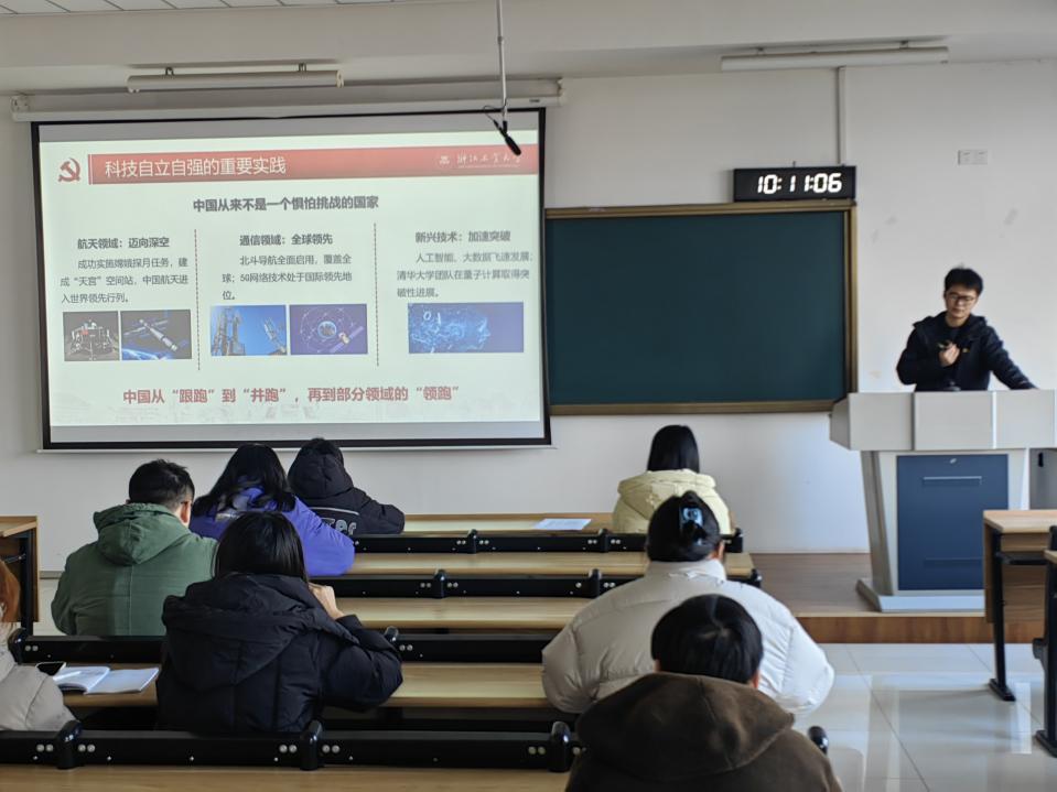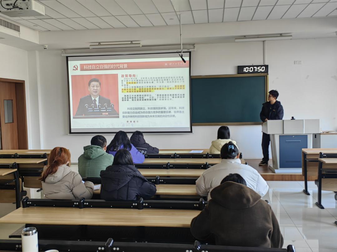 王老师还分析了当前科技发展的挑战与机遇。他指出,科研环境的优化、青年人才的培养以及政策支持的完善为科技自立自强提供了广阔空间。他呼吁青年要牢固树立科技自立自强的信念,主动投身科技创新实践,抓住国家提供的创新机会和成长平台,锤炼科研能力、培养创新思维。他鼓励青年积极参与科技创新活动,发挥协作精神,加强学术交流合作,突破技术瓶颈,用实际行动书写“科技报国”的时代答卷。