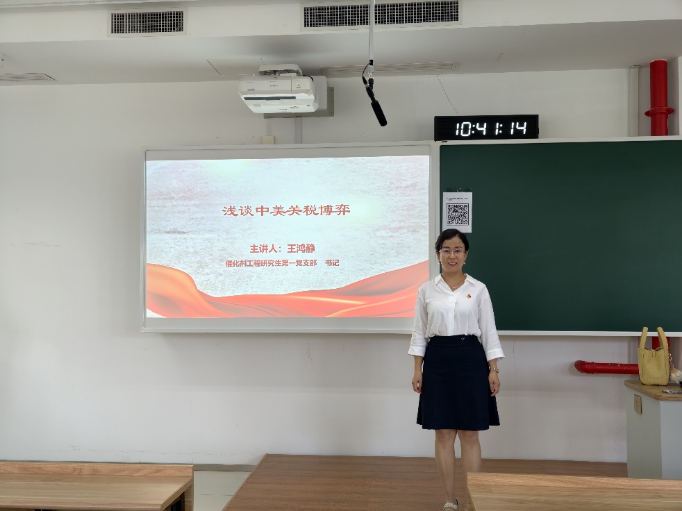 2025年5月19日上午10点,催化剂工程方向研究生第一党支部、催化剂工程方向研究生第二党支部、催化剂工程方向研究生第三党支部、催化剂工程方向研究生第四党支部在莫干山校区化工实训楼C204举办了以“浅谈中美关税”为主题的红色半月谈主题党课,本次党课有幸邀请到了王鸿静老师作为主讲人,为全体党员展示了在面对中美关税博弈中中国的方法与态度。