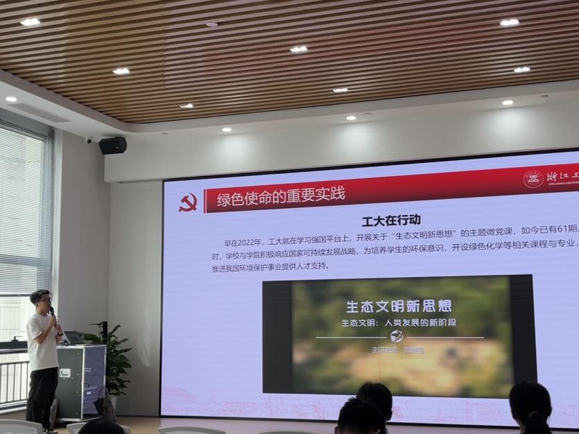 2025年6月5日下午3点,博士研究生直属党支部、联合培养研究生直属党支部、功能膜材料与应用师生联合党支部在莫干山校区图书馆东侧三楼党群服务中心举办了以“绿色使命在肩,青春行动在先”为主题的红色半月谈主题党课。本次党课有幸邀请到了王俭老师作为主讲人,带领同学们深入探讨了青年在环境保护和生态文明建设中的使命与责任。