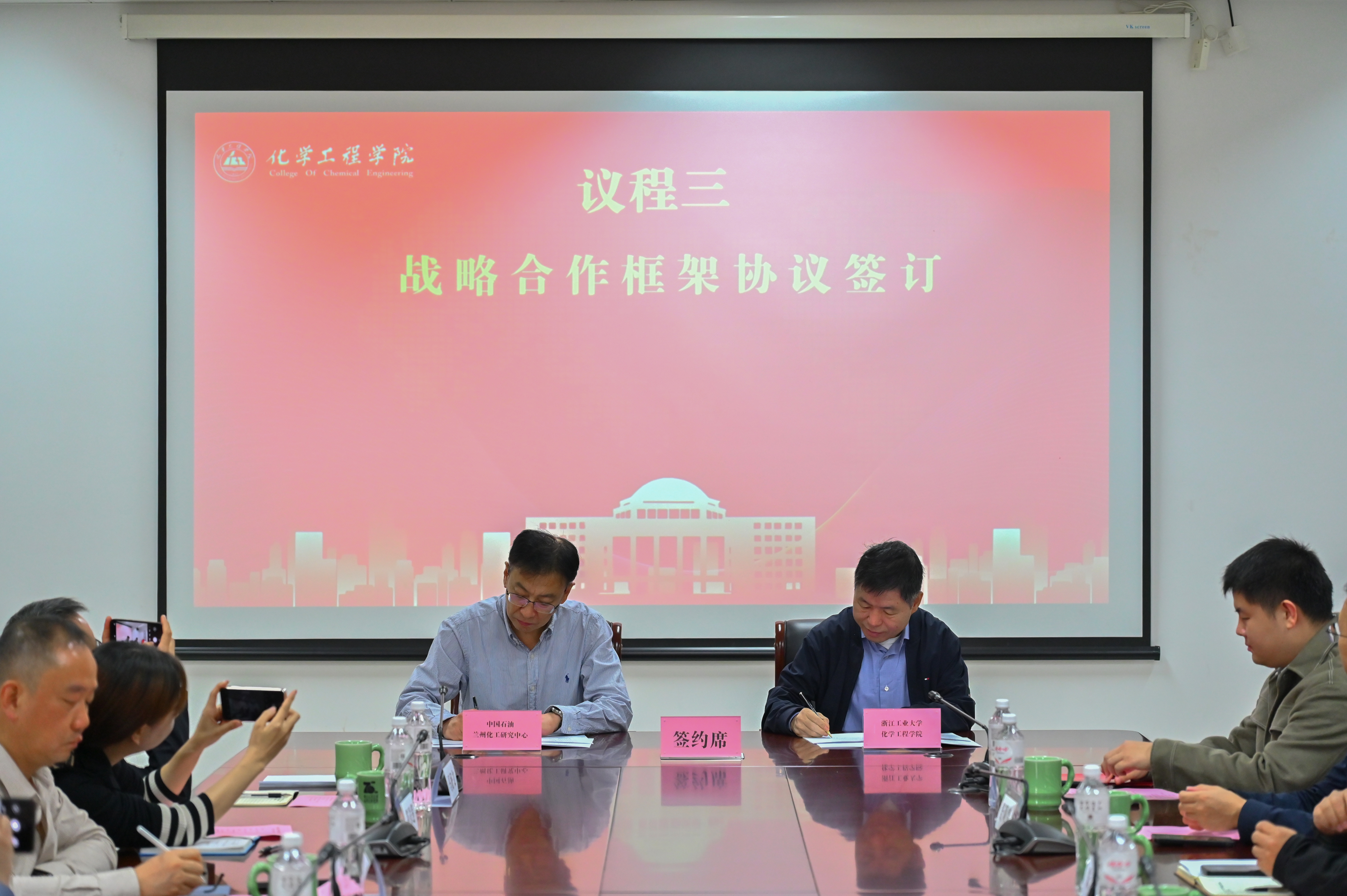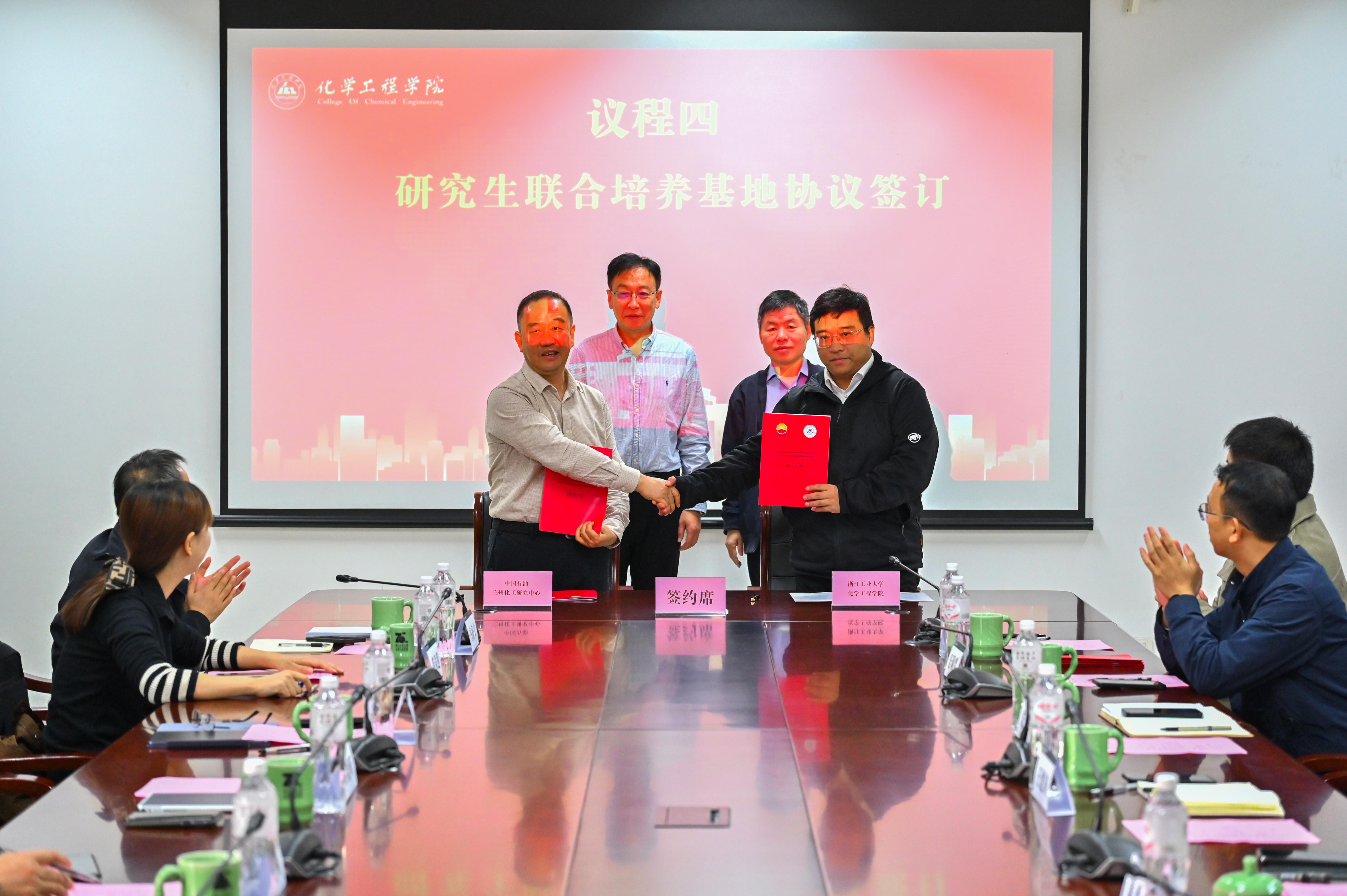 10月23日,中国石油天然气股份有限公司兰州化工研究中心与化学工程学院在莫干山校区举行战略合作框架协议签订仪式、研究生联合培养基地协议签订仪式和研究生联合培养基地揭牌仪式。兰州化工研究中心党委书记常晓昕、副主任谢元,化学工程学院院长王建国、副院长聂勇、朱艺涵,绿色化学合成与转化技术全国重点实验室执行副主任钟兴以及双方相关部门负责人、专家代表等共同出席了本次活动。活动由聂勇主持。